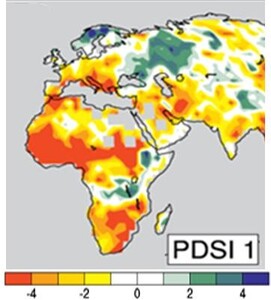 Figure 8 shows the relative dryness of a region using the Palmer Drought Severity Index (PDSI) index. PDSI is used to estimate the severity and duration of droughts. It measures the cumulative deficit (relative to local mean conditions) in surface land moisture by incorporating precipitation data between 1900 and 2002, into a hydrological accounting system. Red and orange areas are drier (wetter) than average and blue and green areas are wetter (drier). It confirms a widespread increase of drought in Africa, except the East African Highlands and central Africa.