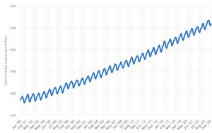 One common byproduct of combustion of hydrocarbons (oil, natural gas, and coal) is CO2 which is added to the environment. The amount of CO2 concentration has reached 427 ppm in 2024 from its preindustrial level of 280 ppm, Fig. 2.